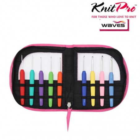 Estuche en polipiel color rosa. Contiene 9 crochets de aluminio con mango soft, modelo Wave de knitPro. Tamaños: 2.00,2.50,3.00,3.50,4.00,4.50,5.00,5.50 y 6.00.